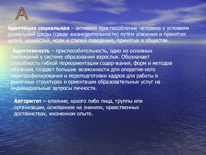 Адаптивность – приспособительность, одно из основных требований к системе образования взрослых. Обозначает способность гибкой переориентации содер-жания, форм и методов обучения, создает большие возможности для оператив-ного перепрофилирования и переподготовки кадров для работы в рыночных структурах и ориентации образовательных услуг на индивидуальные запросы личности.