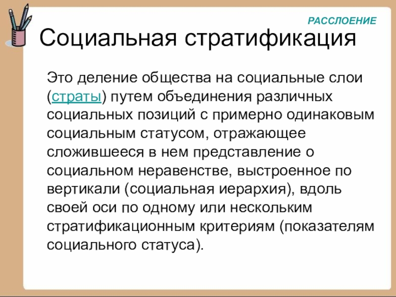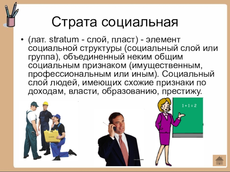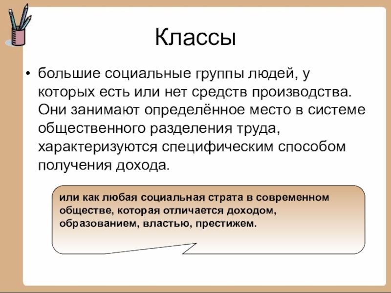 или как любая социальная страта в современном обществе, которая отличается доходом, образованием, властью, престижем.