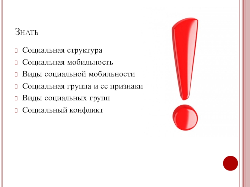 ЗнатьСоциальная структураСоциальная мобильностьВиды социальной мобильностиСоциальная группа и ее признакиВиды социальных группСоциальный конфликт