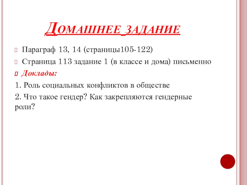 Домашнее заданиеПараграф 13, 14 (страницы105-122)Страница 113 задание 1 (в классе и дома) письменноДоклады:1. Роль социальных конфликтов в