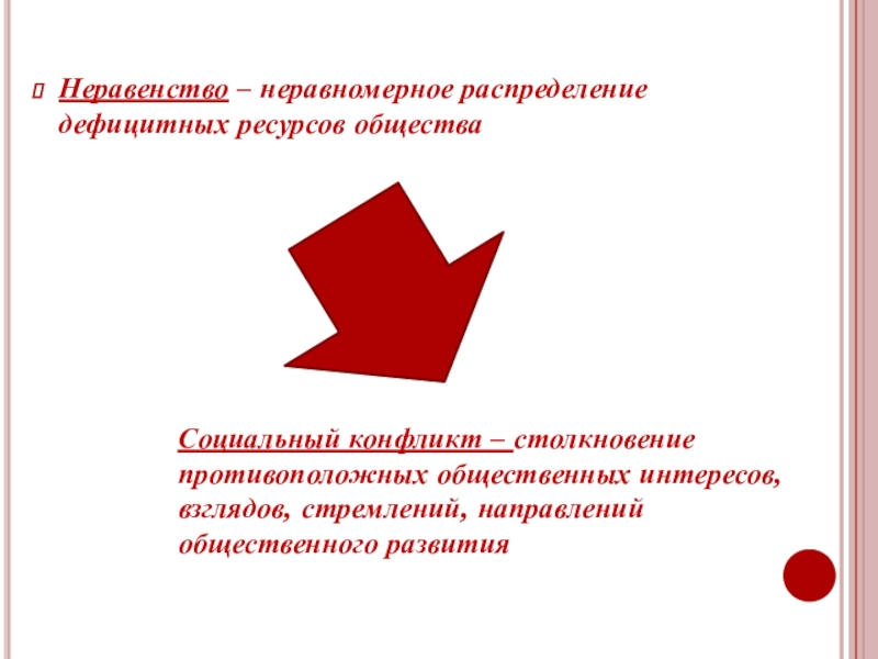 Неравенство – неравномерное распределение дефицитных ресурсов обществаСоциальный конфликт – столкновение противоположных общественных интересов, взглядов, стремлений, направлений общественного