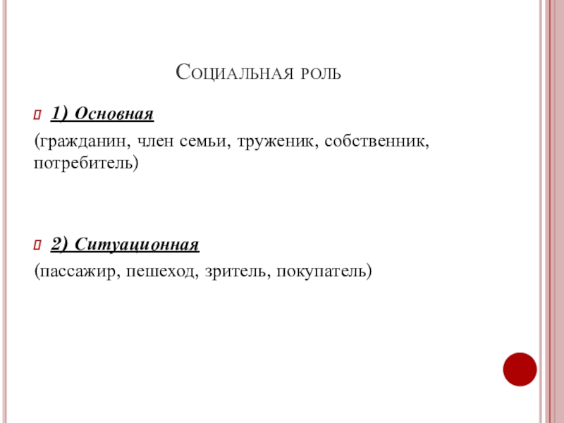 Социальная роль1) Основная (гражданин, член семьи, труженик, собственник, потребитель)2) Ситуационная (пассажир, пешеход, зритель, покупатель)