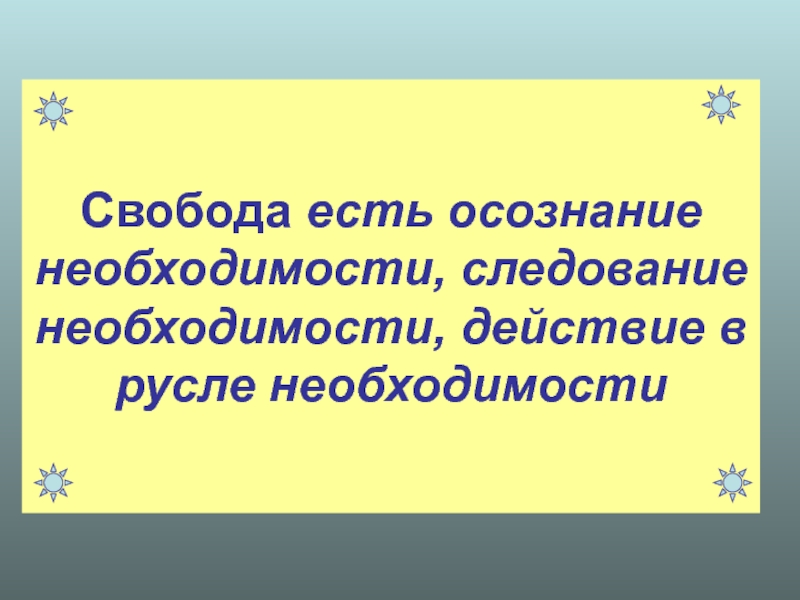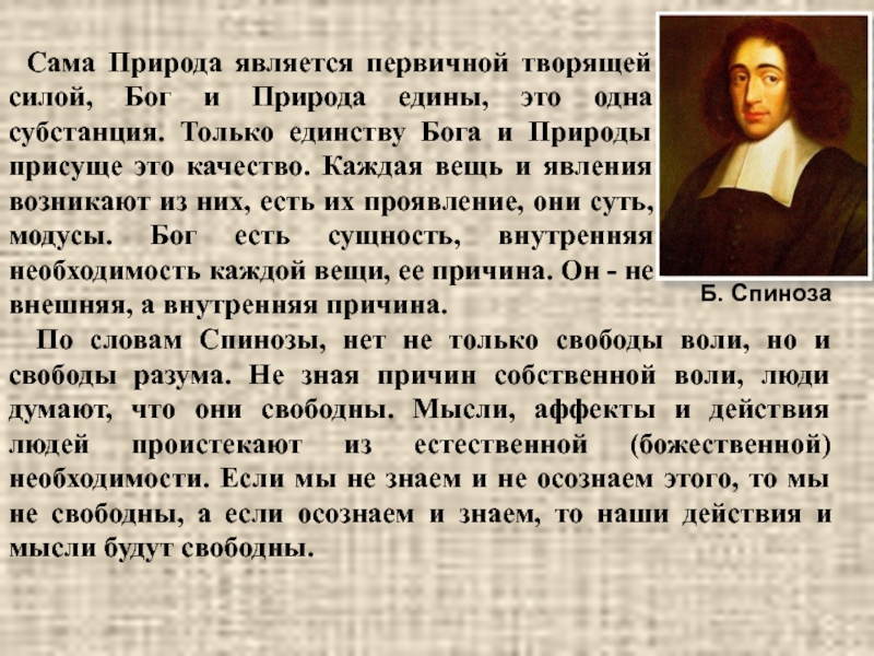 По словам Спинозы, нет не только свободы воли, но и свободы разума. Не зная причин собственной воли, люди думают, что они свободны. Мысли, аффекты и действия людей проистекают из естественной (божественной) необходимости. Если мы не знаем и не осознаем этого, то мы не свободны, а если осознаем и знаем, то наши действия и мысли будут свободны.
