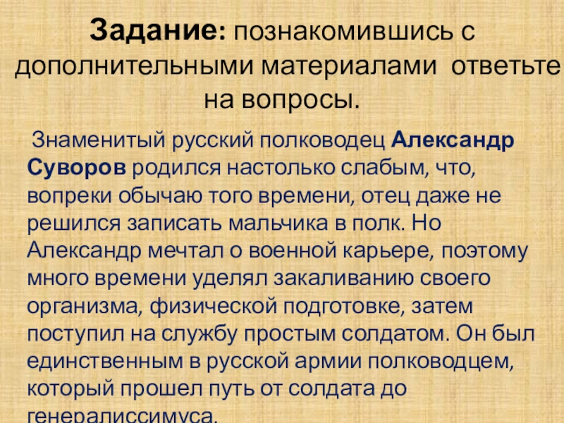 Александр Суворов родился настолько слабым, что, вопреки обычаю того времени, отец даже не решился записать мальчика в полк. Но Александр мечтал о военной карьере, поэтому много времени уделял закаливанию своего организма, физической подготовке, затем поступил на службу простым солдатом. Он был единственным в русской армии полководцем, который прошел путь от солдата до генералиссимуса.