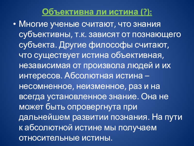 от познающего субъекта. Другие философы считают, что существует истина объективная, независимая от произвола людей и их интересов. Абсолютная истина – несомненное, неизменное, раз и на всегда установленное знание. Она не может быть опровергнута при дальнейшем развитии познания. На пути к абсолютной истине мы получаем относительные истины.