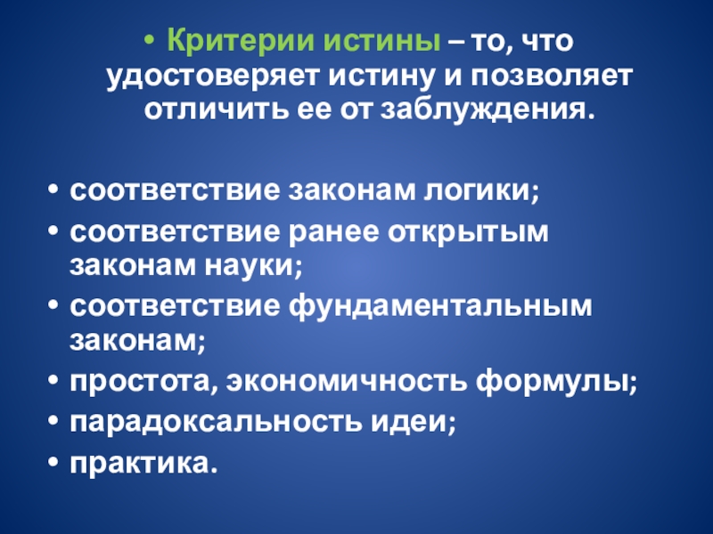 Слайд 18Критерии истины – то, что удостоверяет истину и позволяет отличить ее от