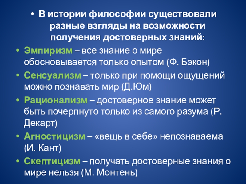 Слайд 10В истории философии существовали разные взгляды на возможности получения достоверных знаний: