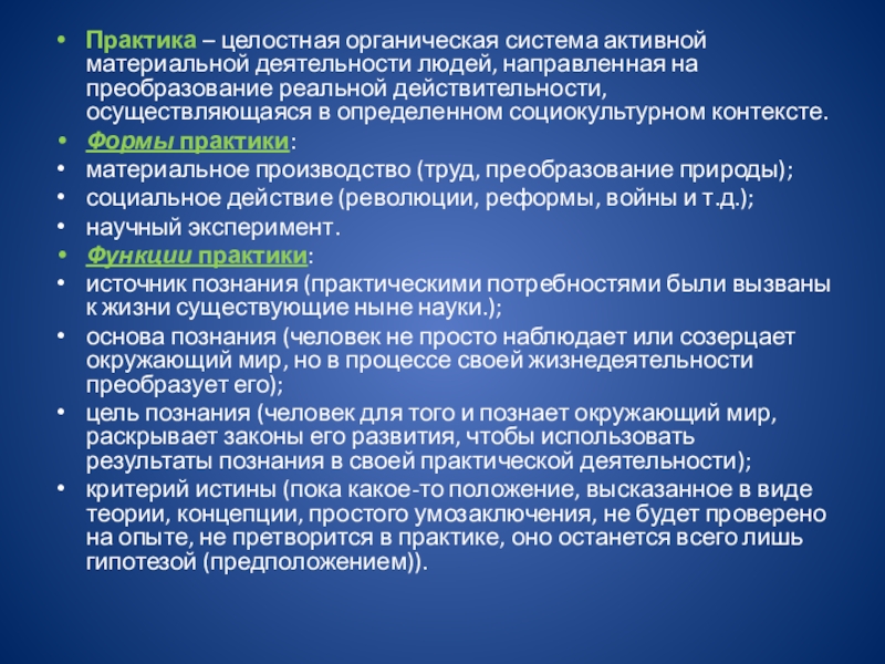 Слайд 20Практика – целостная органическая система активной материальной деятельности людей, направленная на преобразование