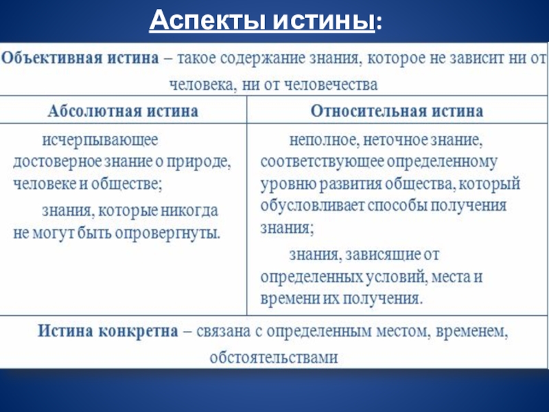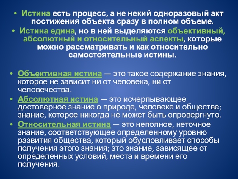 Истина едина, но в ней выделяются объективный, абсолютный и относительный аспекты, которые можно рассматривать и как относительно самостоятельные истины.
