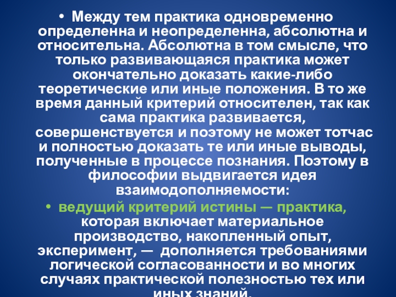 в том смысле, что только развивающаяся практика может окончательно доказать какие-либо теоретические или иные положения. В то же время данный критерий относителен, так как сама практика развивается, совершенствуется и поэтому не может тотчас и полностью доказать те или иные выводы, полученные в процессе познания. Поэтому в философии выдвигается идея взаимодополняемости: