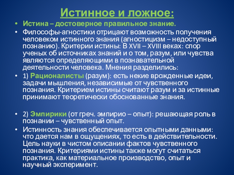 человеком истинного знания (агностицизм – недоступный познанию). Критерии истины: В XVII – XVIII веках: спор ученых об источниках знаний и о том, разум, или чувства являются определяющими в познавательной деятельности человека. Мнения разделились: