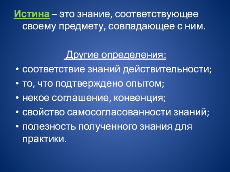 Слайд 16Истина – это знание, соответствующее своему предмету, совпадающее с ним.