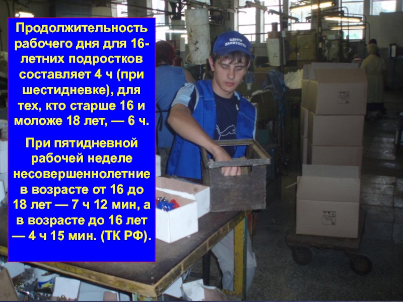 Слайд 6Продолжительность рабочего дня для 16-летних подростков составляет 4 ч (при шестидневке),
