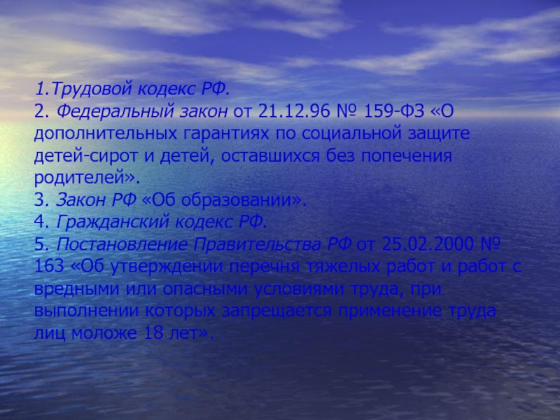 гарантиях по социальной защите детей-сирот и детей, оставшихся без попечения родителей». 3. Закон РФ «Об образовании». 4. Гражданский кодекс РФ. 5. Постановление Правительства РФ от 25.02.2000 № 163 «Об утверждении перечня тяжелых работ и работ с вредными или опасными условиями труда, при выполнении которых запрещается применение труда лиц моложе 18 лет».