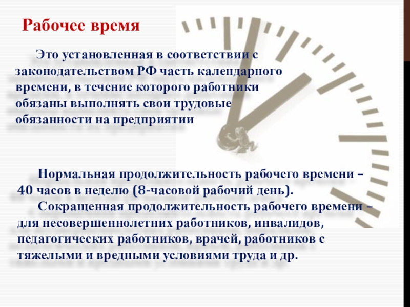 Сокращенная продолжительность рабочего времени – для несовершеннолетних работников, инвалидов, педагогических работников, врачей, работников с тяжелыми и вредными условиями труда и др.