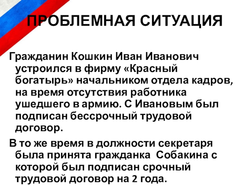 Гражданин Кошкин Иван Иванович устроился в фирму «Красный богатырь» начальником