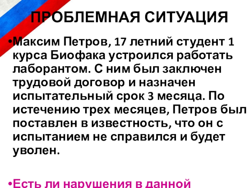лаборантом. С ним был заключен трудовой договор и назначен испытательный срок 3 месяца. По истечению трех месяцев, Петров был поставлен в известность, что он с испытанием не справился и будет уволен.