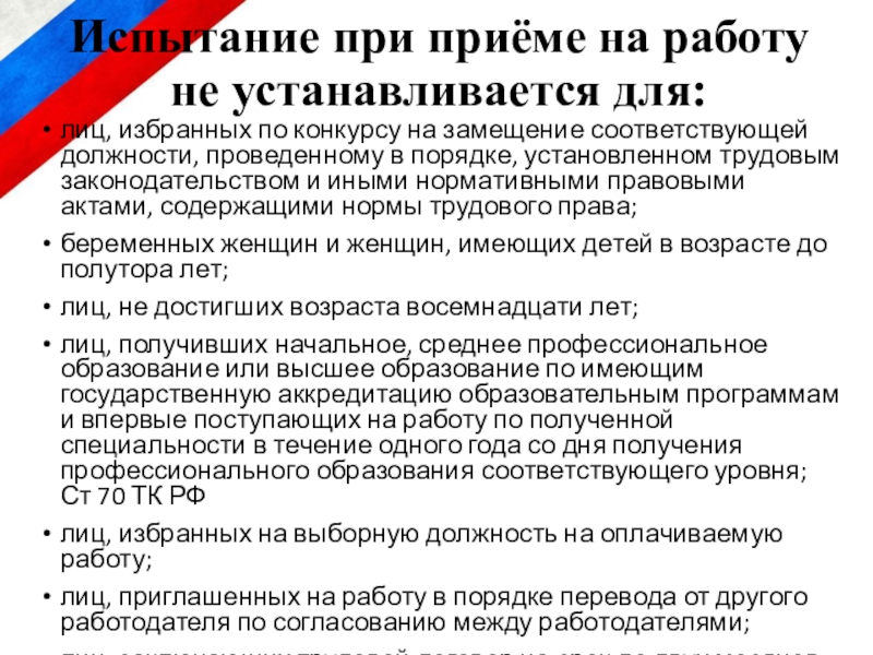 Слайд 12Испытание при приёме на работу не устанавливается для: