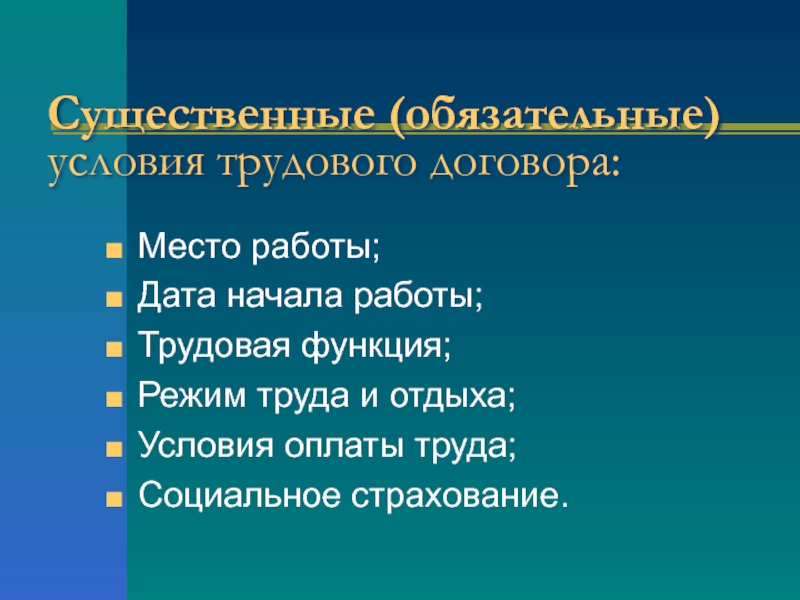 Существенные (обязательные)условия трудового договора:Место работы;Дата начала работы;Трудовая функция;Режим труда и отдыха;Условия оплаты труда;Социальное страхование.