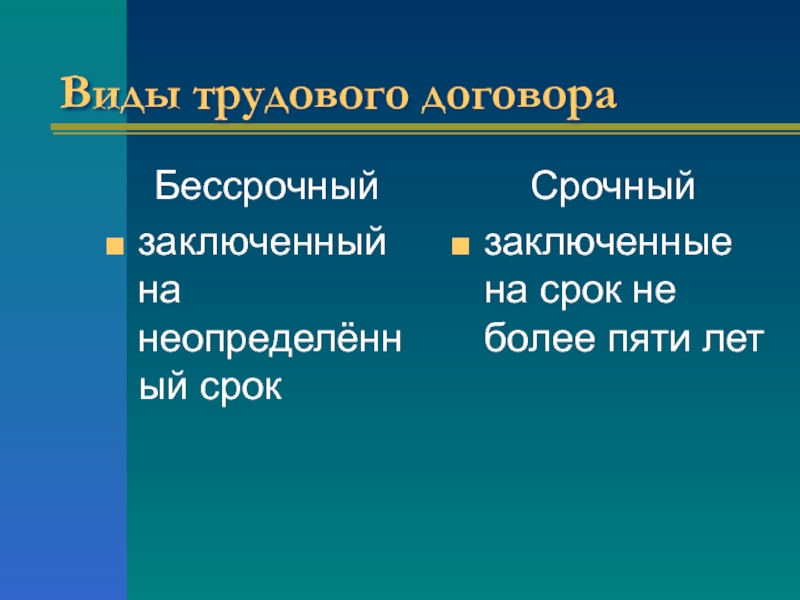 Виды трудового договораБессрочныйзаключенный на неопределённый срокСрочныйзаключенные на срок не более пяти лет