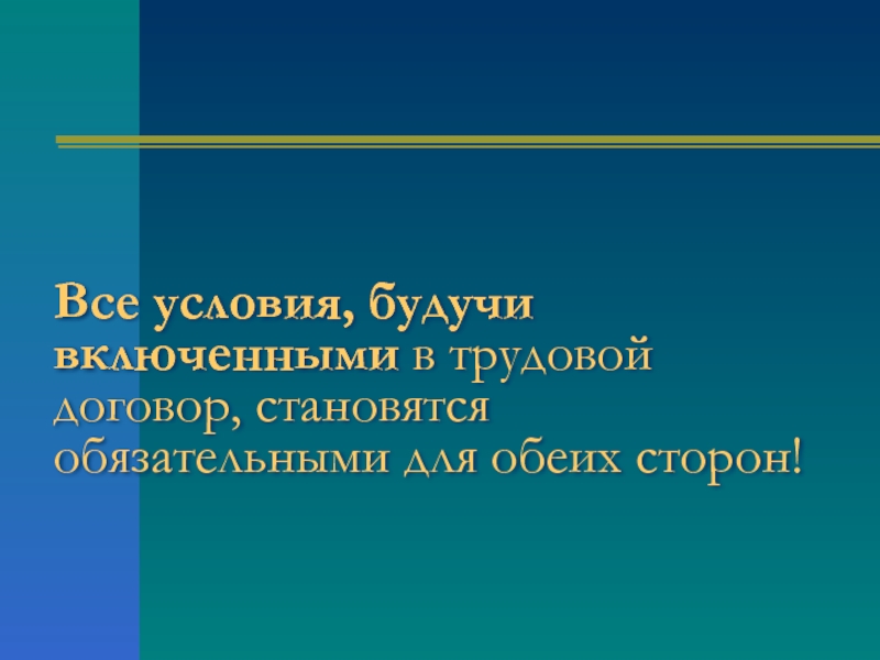 Слайд 8Все условия, будучи включенными в трудовой договор, становятся обязательными для обеих
