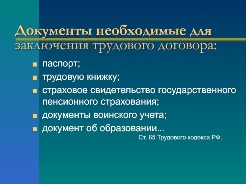 Документы необходимые для заключения трудового договора:паспорт;трудовую книжку;страховое свидетельство государственного пенсионного страхования;документы воинского учета;документ об образовании...