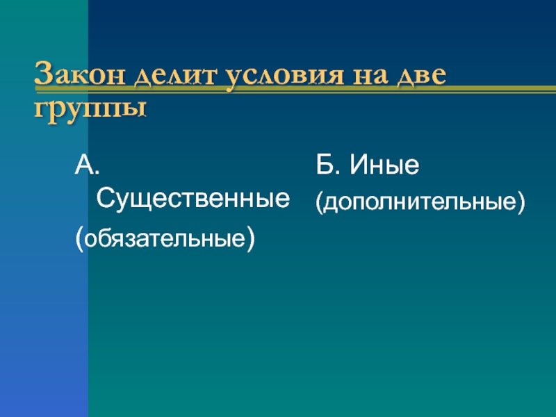 Закон делит условия на две группыА. Существенные(обязательные)Б. Иные(дополнительные)