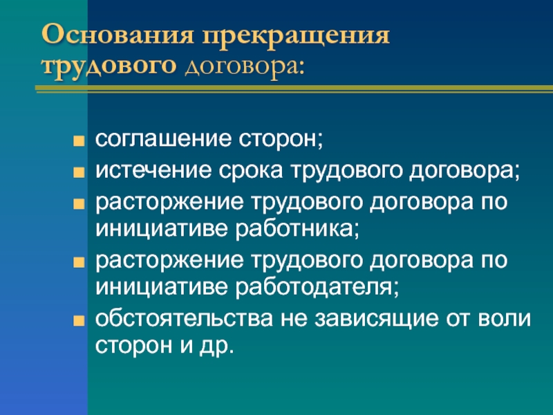 Основания прекращения трудового договора:соглашение сторон;истечение срока трудового договора;расторжение трудового договора по инициативе работника;расторжение трудового договора по инициативе