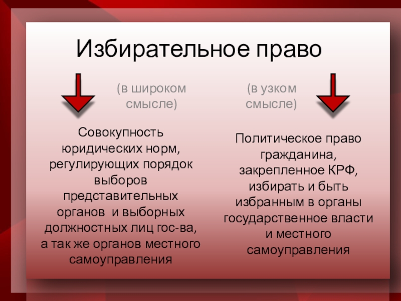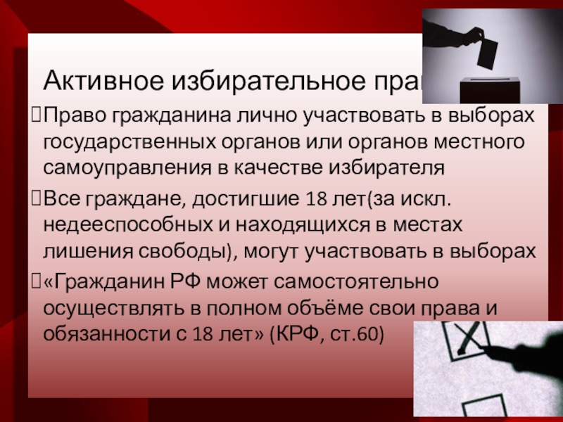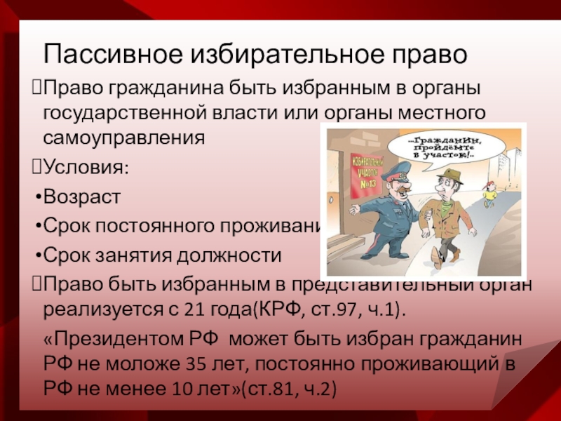 Политическое право гражданина, закрепленное КРФ, избирать и быть избранным в органы государственное власти и местного самоуправления