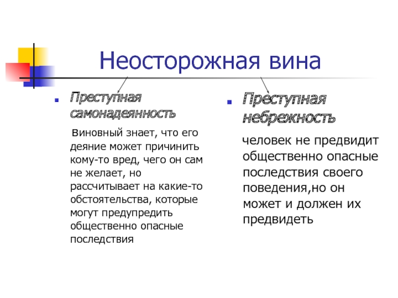 Неосторожная винаПреступная самонадеянность  виновный знает, что его деяние может причинить кому-то вред, чего