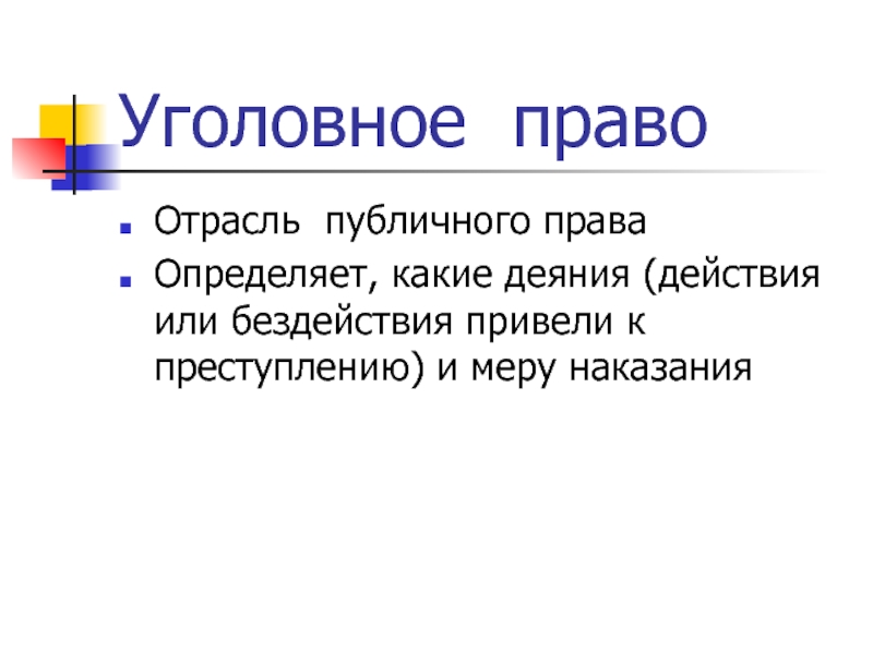 Уголовное правоОтрасль публичного праваОпределяет, какие деяния (действия или бездействия привели к преступлению) и меру наказания