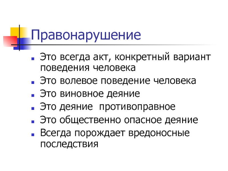 ПравонарушениеЭто всегда акт, конкретный вариант поведения человекаЭто волевое поведение человекаЭто виновное деяниеЭто деяние противоправноеЭто общественно опасное деяниеВсегда