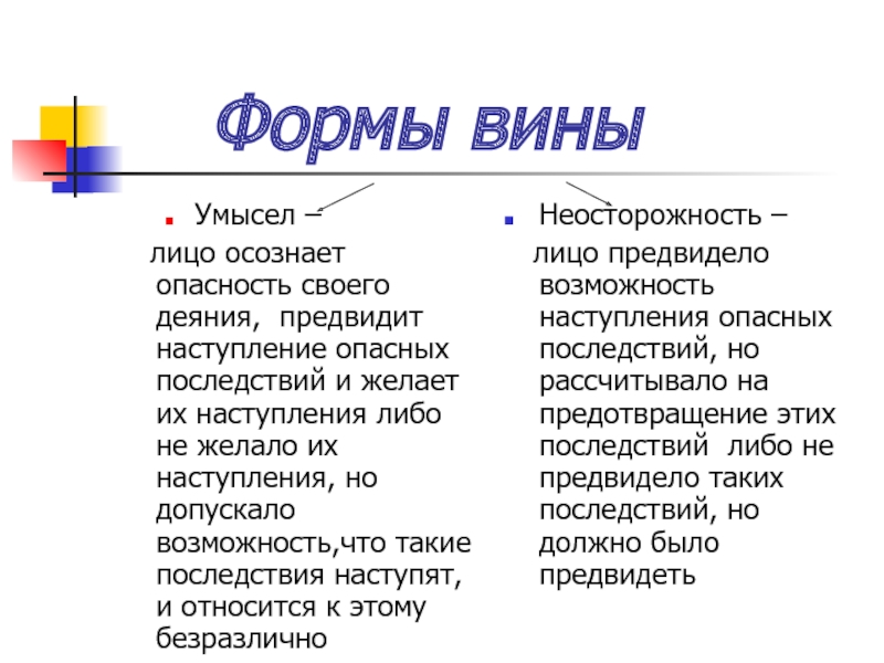 Формы виныУмысел –  лицо осознает опасность своего деяния, предвидит наступление опасных последствий и желает