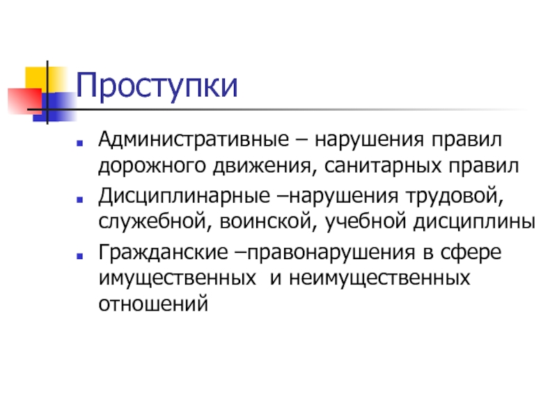 ПроступкиАдминистративные – нарушения правил дорожного движения, санитарных правилДисциплинарные –нарушения трудовой, служебной, воинской, учебной дисциплиныГражданские –правонарушения в сфере