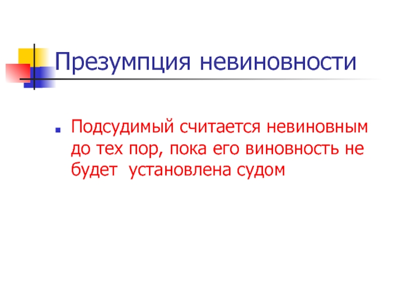 Презумпция невиновностиПодсудимый считается невиновным до тех пор, пока его виновность не будет установлена судом