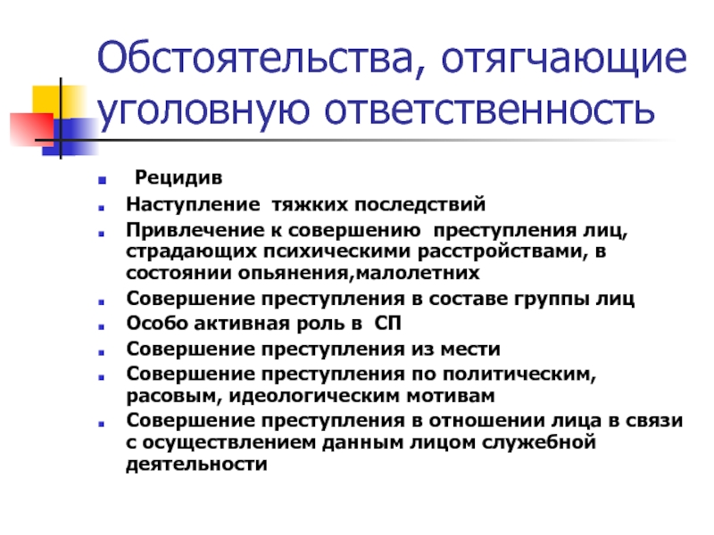 Обстоятельства, отягчающие уголовную ответственность Рецидив Наступление тяжких последствийПривлечение к совершению преступления лиц, страдающих психическими расстройствами, в состоянии