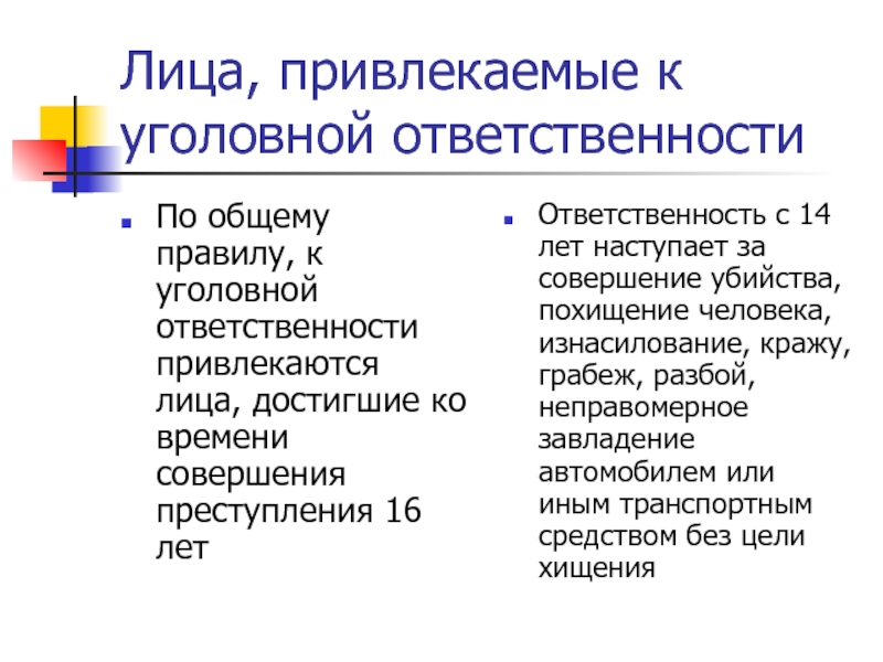 Лица, привлекаемые к уголовной ответственностиПо общему правилу, к уголовной ответственности привлекаются лица, достигшие ко времени совершения преступления