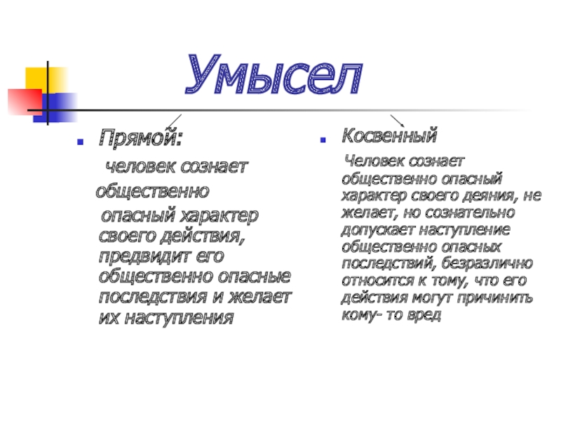 УмыселПрямой:  человек сознает  общественно  опасный характер своего действия, предвидит