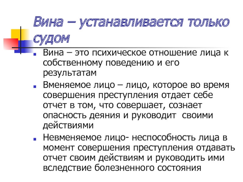 Вина – устанавливается только судомВина – это психическое отношение лица к собственному поведению и его результатамВменяемое лицо
