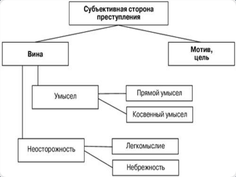 Субъективная сторона преступления — это психическое отношение лица к совершаемому им преступлению, которое характеризуется конкретной формой вины, мотивом и целью.