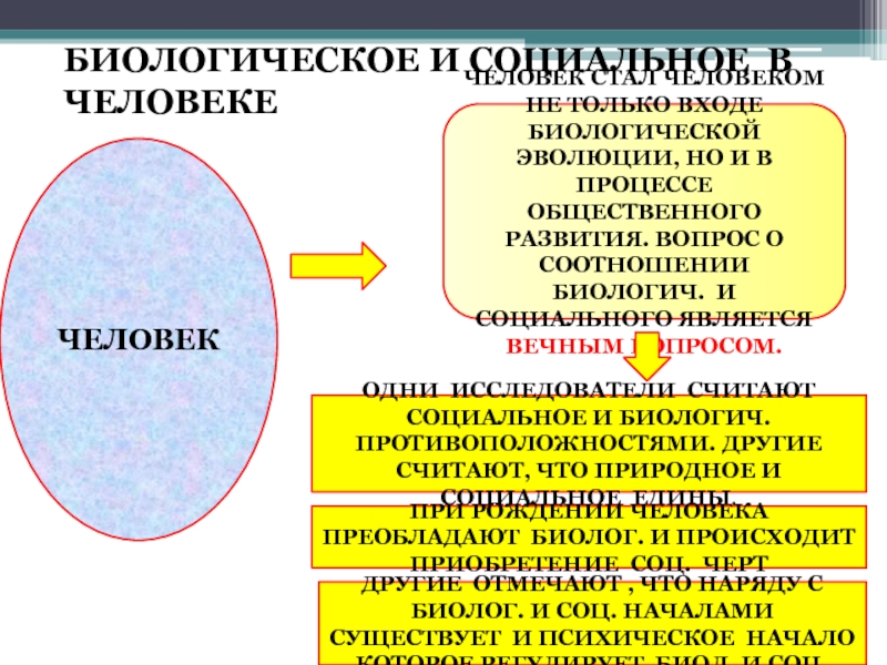 ОДНИ ИССЛЕДОВАТЕЛИ СЧИТАЮТ СОЦИАЛЬНОЕ И БИОЛОГИЧ. ПРОТИВОПОЛОЖНОСТЯМИ. ДРУГИЕ СЧИТАЮТ, ЧТО ПРИРОДНОЕ И СОЦИАЛЬНОЕ ЕДИНЫ.