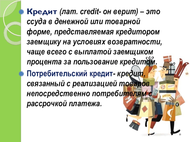 Слайд 29Кредит (лат. сredit- он верит) – это ссуда в денежной или