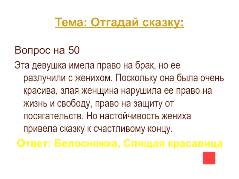 ее разлучили с женихом. Поскольку она была очень красива, злая женщина нарушила ее право на жизнь и свободу, право на защиту от посягательств. Но настойчивость жениха привела сказку к счастливому концу.