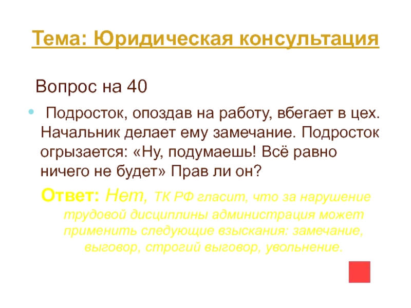 в цех. Начальник делает ему замечание. Подросток огрызается: «Ну, подумаешь! Всё равно ничего не будет» Прав ли он?