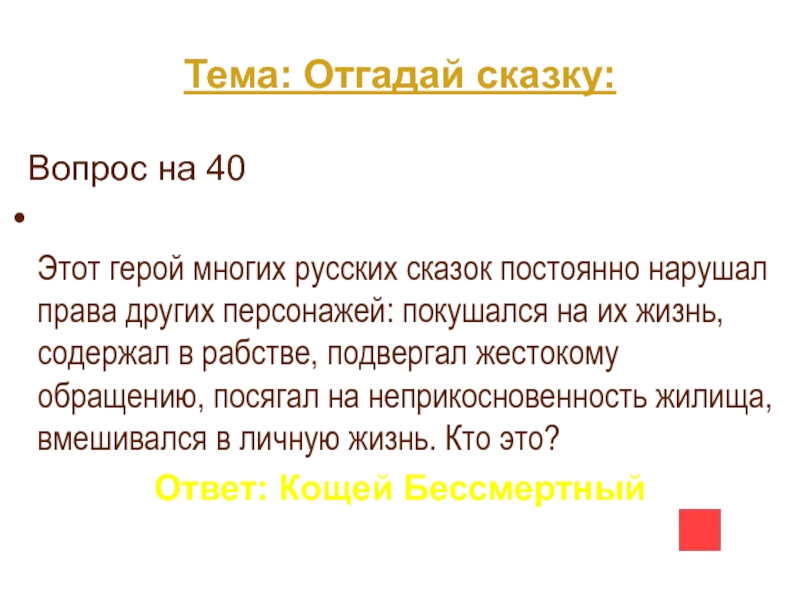 Этот герой многих русских сказок постоянно нарушал права других персонажей: покушался на их жизнь, содержал в рабстве, подвергал жестокому обращению, посягал на неприкосновенность жилища, вмешивался в личную жизнь. Кто это?