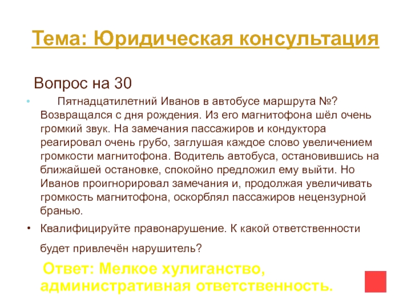 автобусе маршрута №? Возвращался с дня рождения. Из его магнитофона шёл очень громкий звук. На замечания пассажиров и кондуктора реагировал очень грубо, заглушая каждое слово увеличением громкости магнитофона. Водитель автобуса, остановившись на ближайшей остановке, спокойно предложил ему выйти. Но Иванов проигнорировал замечания и, продолжая увеличивать громкость магнитофона, оскорблял пассажиров нецензурной бранью.