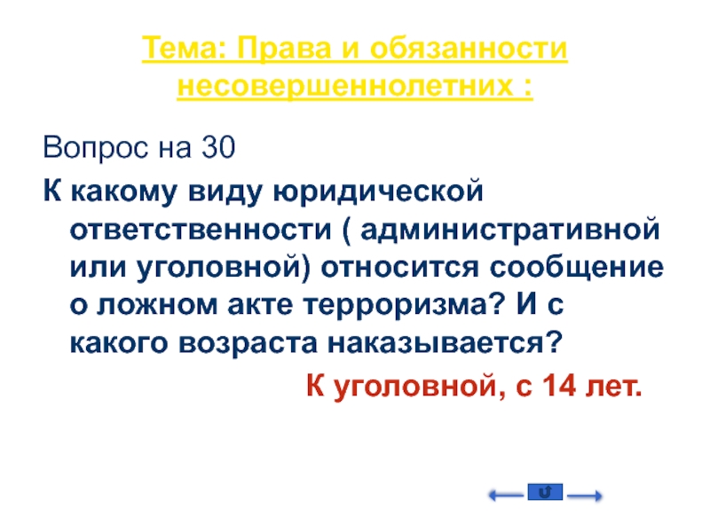 Слайд 7Тема: Права и обязанности несовершеннолетних :