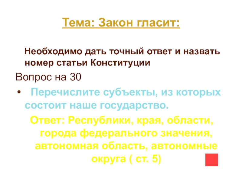 Ответ: Республики, края, области, города федерального значения, автономная область, автономные округа ( ст. 5)