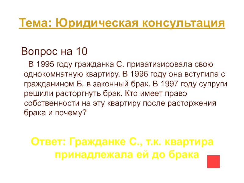 гражданка С. приватизировала свою однокомнатную квартиру. В 1996 году она вступила с гражданином Б. в законный брак. В 1997 году супруги решили расторгнуть брак. Кто имеет право собственности на эту квартиру после расторжения брака и почему?