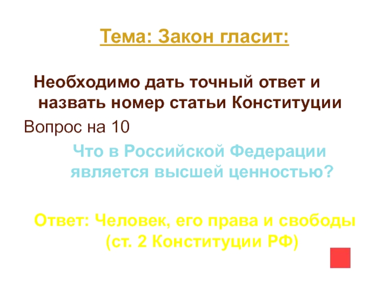 Ответ: Человек, его права и свободы (ст. 2 Конституции РФ)